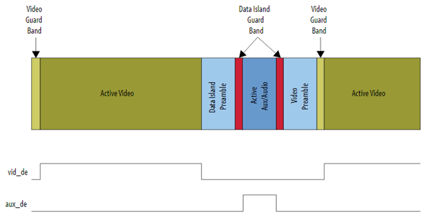 Data Island Period는 패킷 형태로 전송되며, 오디오 및 비디오 정보 설명에 사용되는 정보 프레임 및 기타 데이터를 포함하는 오디오 데이터 및 보조 데이터를 전송합니다.