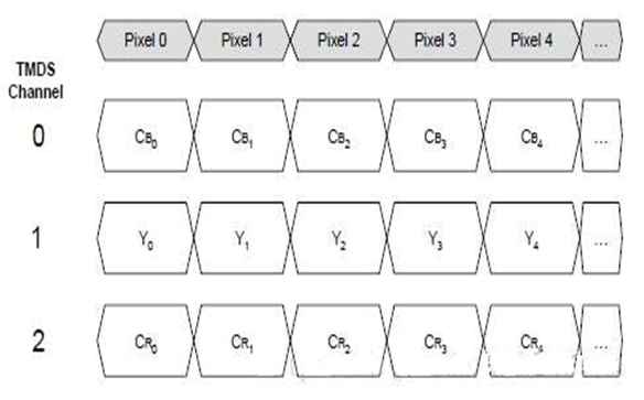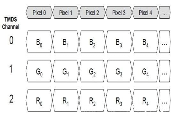 비디오 데이터를 전송하고 HDMI에서 사용할 때 3개의 TMDS 트위스트 페어(케이블)를 사용하여 비디오 데이터를 전송합니다. 세 개의 링크 각각은 서로 다른 RGB 구성 요소에 해당합니다.