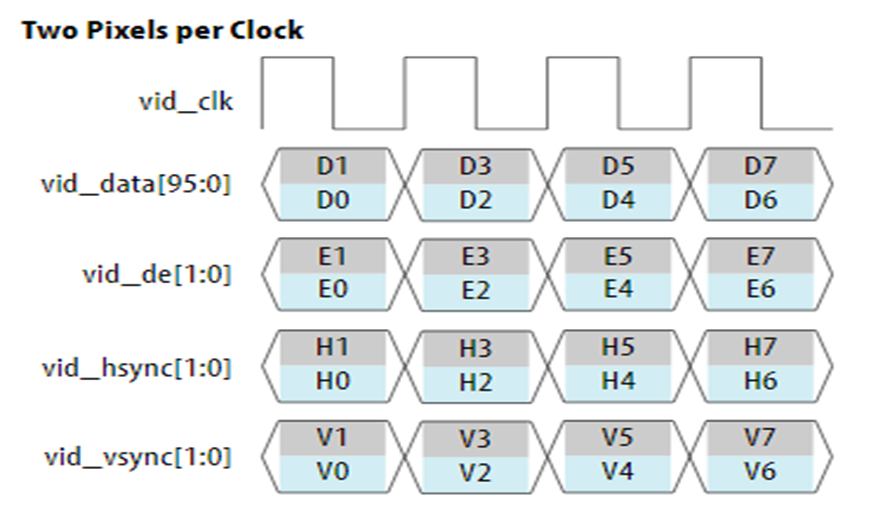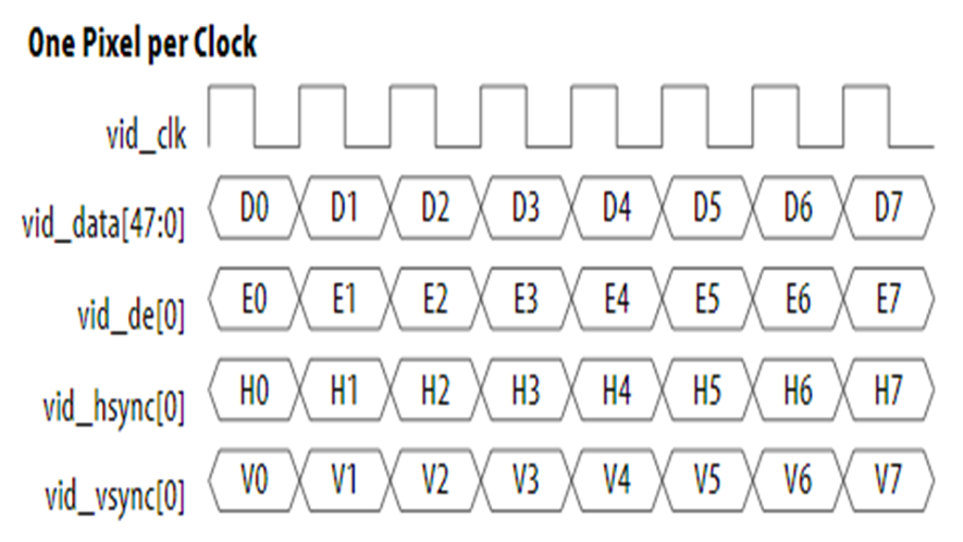위의 그림은 Clock당 1, 2픽셀로 비디오 데이터, 비디오 데이터 활성화, 비디오 H-SYNC, 비디오 V-SYNC의 배열을 보여줍니다.