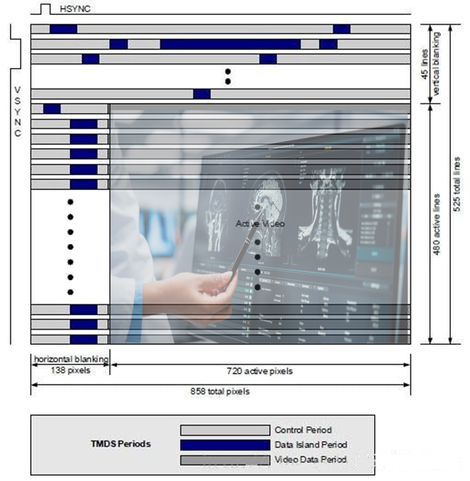Control Period, Data Island Period, Video Data Period 3가지 전송 단계의 전환 프로세스는 위의 그림과 같습니다.