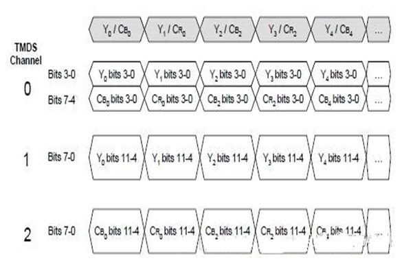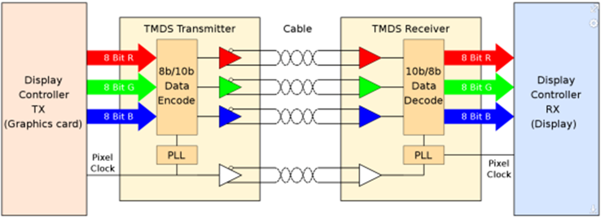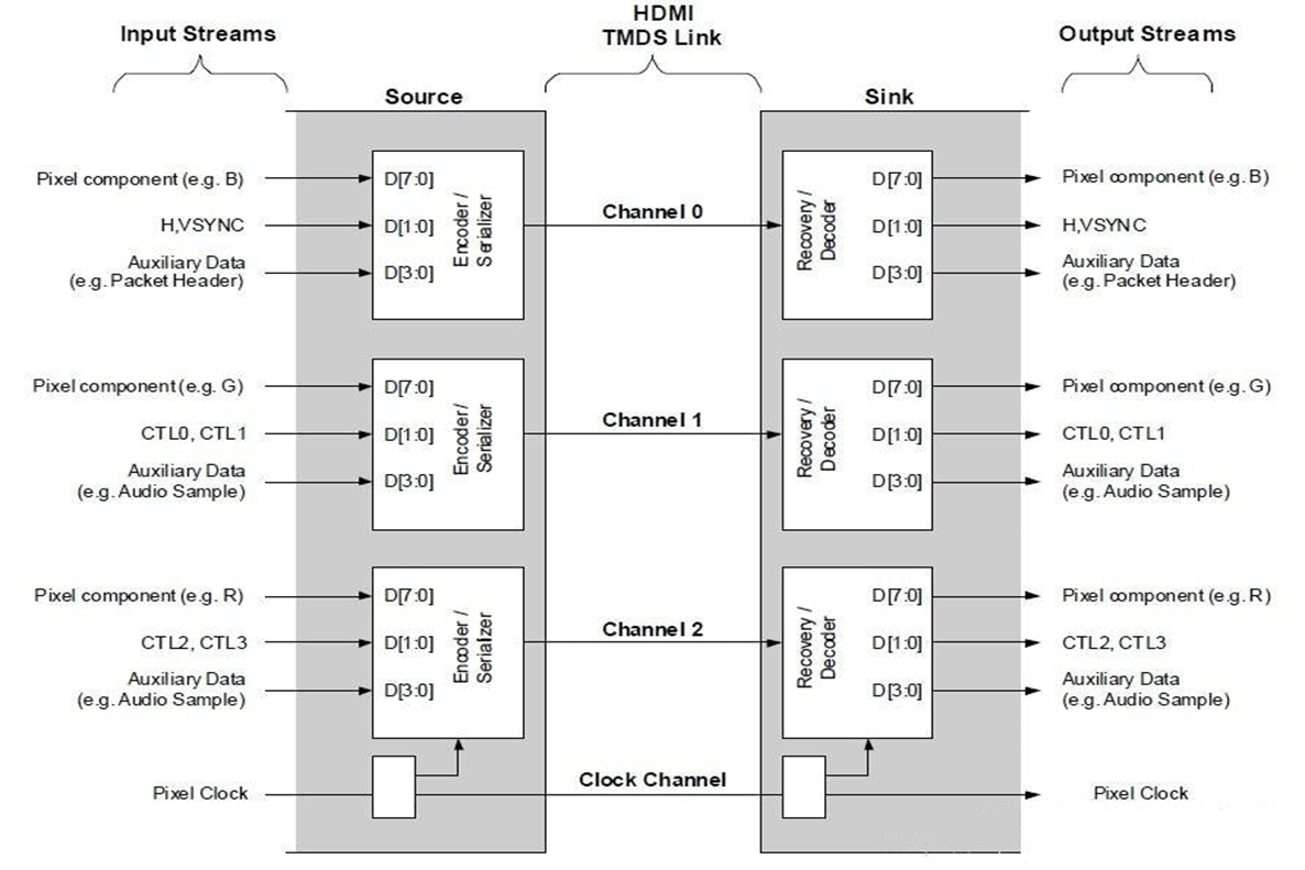Source의 각 색상 8bit 데이터는 TMDS encoder를 거쳐 10bit 데이터를 얻은 후, Serializer를 거쳐 직렬로 출력됩니다. Sink에서는 10비트 데이터가 먼저 복원된 후 TMDS decoder를 통해 8비트 소스 데이터를 얻습니다.