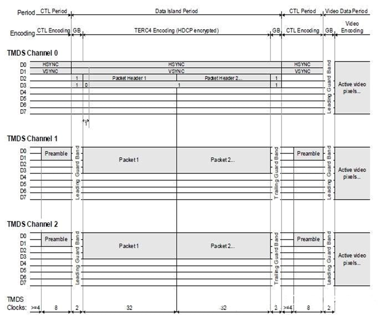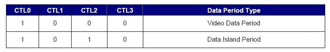 프리앰블 정보 조합에는 다음 두가지 유형 Video Data Period에 대한 CTL0:3=1000과, Data Island Period에 대한 CTL0:3=1010가 있습니다. HSYNC, VSYNC도 이때 변경될 수 있습니다.