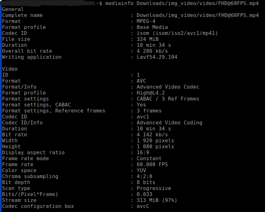 리눅스에서 미디어 파일 정보를 보여주는 명령어는 mediainfo이며 명령어 사용 후 나오는 정보는 아래와 같습니다.