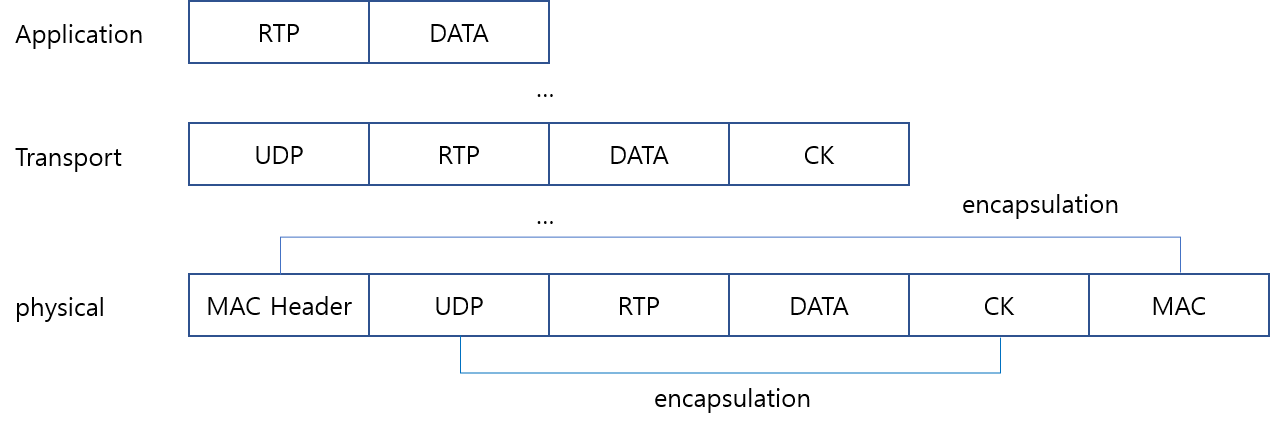 각 Layer에서 있는 packet 중 RTP(Real Time protocol)은 Timestamp, Sequence 역할을 하며 Transprot 계층에서 udp와 clock을 양쪽 끝에 위치시켜 packet이 손상되었는지 확인을 하는 encapsulation을 합니다. physical 계층에서 또한 MAC Header와 MAC으로 encapsulation 합니다.