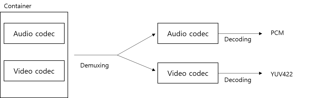 컨테이너를 demuxing이라는 작업을 통해 코덱들이 나눠지고 코덱을 decoding 하면 audio(pcm 등)와 video(RGB, YUV422 등) 각각의 raw data가 나옵니다.