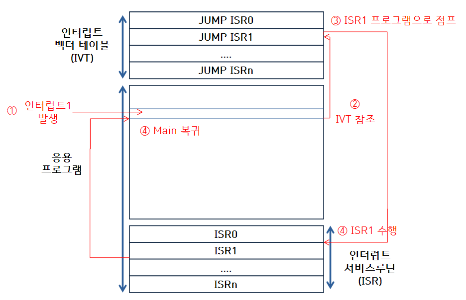 인터럽트 서비스 루틴(ISR)은 각 인터럽트가 발생하였을 때, 수행할 프로그램이 정의된다.